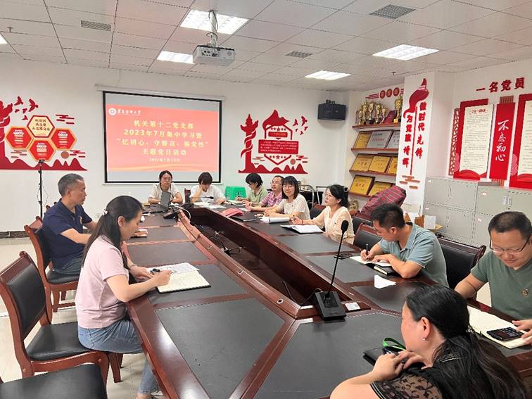 7月13日,机关第十二党支部在401党员活动室组织开展2023年7月集中学习暨“忆初心、守誓言、强党性”主题党日活动。会议由党支部书记姚新生主持,研究生院院长宋鸿、研究生院副院长申旭波和支部全体党员同志参加。