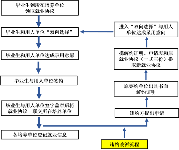 1.就业协议书违约改派:学生和用人单位在就业协议书上签字盖章后,双方因各种原因提出解除协议,需按照违约改派流程办理相关程序(补办申请表见附件3)。