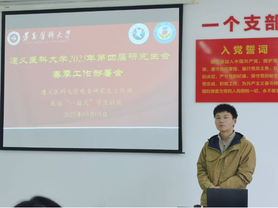 3月5日下午,遵义医科大学研究生会在致远“一站式”学生社区党员活动室召开2025年春季学期工作部署会,会议由主席团成员李龙飞主持,党委研究生工作部思想政治教育科成文洁、校团委文宣部谭梦狄老师及研究生会全体成员参加。